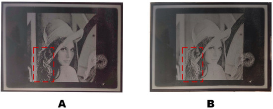 The picture of “Lena” displayed on the EWD, the red rectangles show the difference between the two different waveforms. (A) Display with the +15 V DC waveform. (B) Display with the proposed multi-DC waveform.