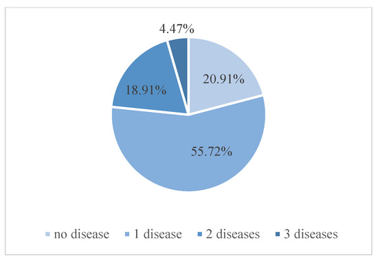 The Retinal Fundus Multi-Disease Image Dataset (RFMiD) consists of 3200 images with labels for 45 different diseases. The dataset is divided into 3 subsets: 60% for the training set (1920 images), 20% for the test set (640 images), and 20% for the validation set (640 images). Each subset has 26 diseases labeled independently, and 19 other disease categories are combined and labeled “other”. This ultimately constitutes 28 categories for the classification of diseases. Figure 3 shows the histogram statistics of the number of images versus the number of disease categories in the RFMiD dataset, including the number of images for 23 diseases in the (10, 200) interval and the number of images for only 1 disease in the (580, 770] interval. Figure 4 shows the multi-label image information statistics, and the number of images with only 1 disease in the RFMiD dataset accounts for 55.72%, and the number of images with 2 or more diseases accounts for 23.38%. Table 1 lists the image distribution used for the training set. It can be seen from Figure 4 and Table 1 that the distribution of the image numbers of different categories is uneven, and most images have more than one disease label.