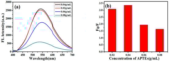 Figure 1b shows the relative fluorescence intensity values after the addition of equal amounts of Cu2+ (20 μM) to the complexes formed by different concentrations of APTES and ZCGQDs. With the increase in the APTES concentration, the agglomeration degree of the ZCGQDs complexes weakened, the relative fluorescence intensity increased, and the quenching efficiency increased. However, when the APTES concentration increased to a certain extent, the relative fluorescence intensity did not increase but decreased. The excessive increase in the APTES concentration caused the coating layer of the ZCGQDs complexes to be too thick, thus destroying the fluorescence emission of the quantum dots caused by surface defects, decreasing the relative fluorescence intensity, and reducing the quenching efficiency. Notably, 0.04 g·mL−1 APTES had the highest relative fluorescence intensity and the highest quenching efficiency. Therefore, the concentration of 0.04 g·mL−1 APTES was selected to synthesize the ZCGQDs complexes for subsequent experimental analysis.