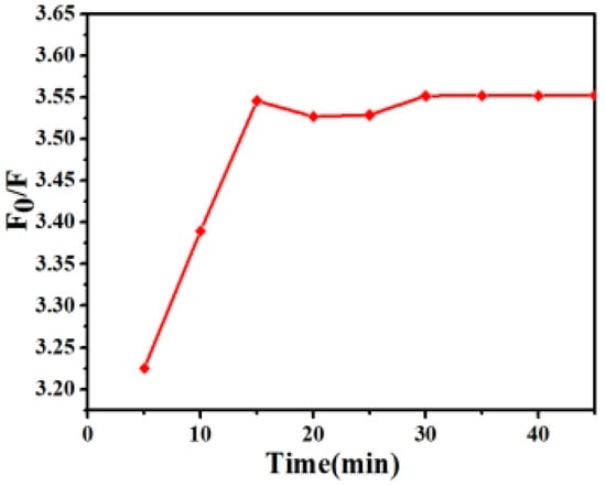 As shown in Figure 2, nine time points were selected from 5 to 45 min to determine the extent of the fluorescence quenching of Cu2+ and ZCGQDs complexes at different mixing times [,]. In the range of 5–15 min, the quenching efficiency enhanced with increasing time and remained basically stable after 15 min. The highest efficiency was reached at 15 min. In order to improve the fluorescence properties of the ZCGQDs complexes in subsequent experiments, a fixed mixing time of 15 min was selected.