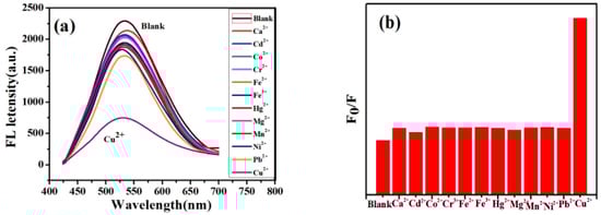 Figure 3a,b show the effects of different metal ions on the fluorescence intensity of the ZCGQDs complexes under the same concentration conditions. It was found that Cu2+ resulted in a marked fluorescence quenching phenomenon on the ZCGQDs complexes, and the as-prepared ZCGQDs complexes exhibited good selectivity toward Cu2+.