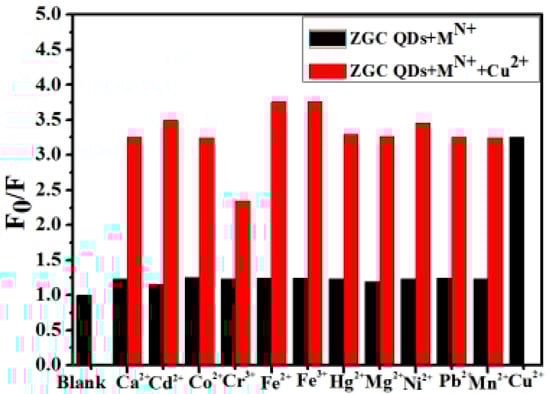 Different metal ions of equal concentration were prepared and added to ZCGQDs composite samples, and the mixtures were shaken to obtain the colloidal solutions of the different metal ions. Then, Cu2+ was added to the solutions and shaken well, and the mixtures were left to stand for 15 min to test their anti-interference performance []. The changes in the fluorescence intensity of the ZCGQDs complexes before and after the addition of Cu2+ were measured. The fluorescence intensity values were marked as F0 and F, and the relative fluorescence intensity (marked as F0/F) was used to represent the corresponding fluorescence quenching rate. In order to reduce the systematic error, the above process was repeated three times, and the average fluorescence intensity values were calculated. As shown in Figure 4, Cu2+ still exhibited strong fluorescence quenching under the same concentration of different metals, and the fluorescence quenching efficiency did not significantly change compared with Cu2+ without interference, which indicates that the prepared ZCGQDs composites had good anti-interference capability toward Cu2+.