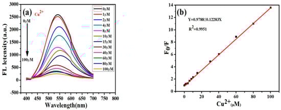Figure 5. (a) Fluorescence spectra of different concentrations of Cu2+; (b) fitted curve of the linear relationship.