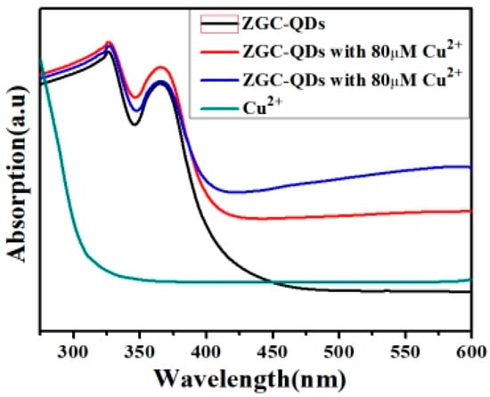 As shown in Figure 7, after the different concentrations of Cu2+ were added to the ZCGQDs solutions, their ultraviolet absorption spectra were plotted, and no obvious difference was observed. This indicates that the sol system formed a new non-fluorescent complex, and the reason for the fluorescence quenching of ZCGQDs complexes by Cu2+ was the dynamic quenching caused by energy transfer.