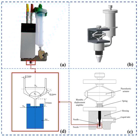 Design of the studied piezoelectric ejection system and dimensions of core components (nozzle and needle). (a) Physical drawings, (b) three-dimensional drawings, (c) two-dimensional simplified drawings, (d) two-dimensional drawings of core components.