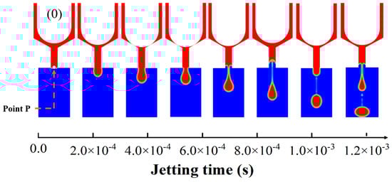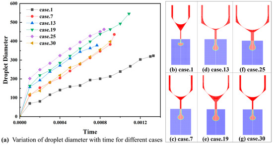 Figure 6 shows the variation pattern of the jetting velocity for cases 1, 6, 13, 19, 25, and 30, and Figure 7 shows their droplet diameter variation patterns, and also includes the velocity cloud and volume fraction cloud at the time of droplet detachment from the nozzle, indicating that the jetting velocity and droplet diameter variation patterns are different for each case. From the figure, it can be seen that the jetting velocity of case 7 is 3.52 m/s and the droplet diameter at the time of detachment is 436 μm.