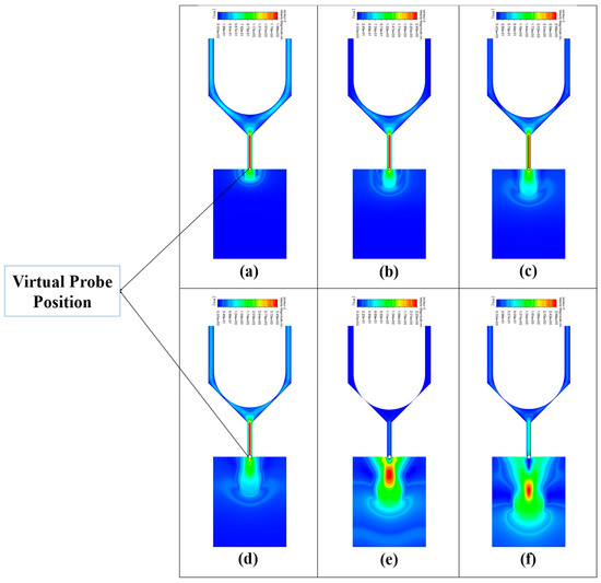 Velocity variation of the virtual probe (point P) in case 7 at different moments: (a) time = 0.0002 s, (b) time = 0.0004 s, (c) time = 0.0006 s, (d) time = 0.0008 s, (e) time = 0.001 s, (f) = 0.0012 s.