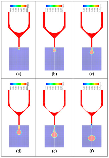 Results of finite element simulation of droplet diameter at different times in case 7: (a) time = 0.0002 s, (b) time = 0.0004 s, (c) time = 0.0006 s, (d) time = 0.0008 s, (e) time = 0.001 s, (f) = 0.0012 s.