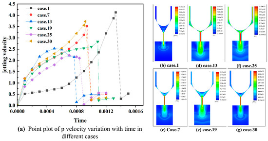 (a–g) Variation in jetting velocity with time, for different cases.