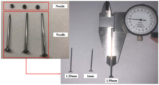 Some researchers have conducted experiments on the parametric design of nozzles and needles. Based on the basic principles of fluid dynamics, Bartolo et al. [9] used computational fluid dynamics modeling to measure material properties (viscosity); Mao et al. [10] proposed a soft fluidic roller, using a simple structure composed of a bendable and twistable electrohydrodynamic (EHD) pump and a layer of natural latex; K.S. Kwon et al. [11] measured process parameters (contact angle) using fluid dynamics modeling; Mao et al. [12] studied a bendable and twistable electrohydraulic pump, by means of digital fabrication; and M. Tsai et al. [13] investigated the effect of pulsed voltage on droplet injection behavior.