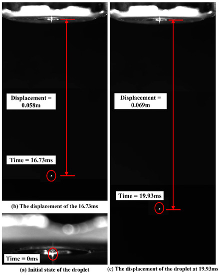 Displacement of the second group of experiments at different moments. (a) initial state of the droplet, (b) the displacement of the 16.73 ms, (c) the displacement of the droplet at 19.93 ms.