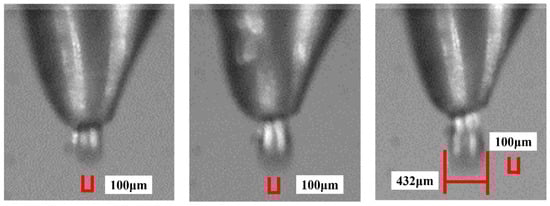 Case 27 was used as an example for validation. A needle with a diameter of 1.25 mm, and a nozzle with a diameter of 0.16 mm and a taper of 75°, were used in the experiments, and the specific parts are shown in Figure 9. Several measurements and calculations were performed for different injection velocities and droplet diameters. Five sets of experiments were conducted in this study, and each set of experiments recorded data for two different displacements and times, and finally the jet velocity was calculated according to the equation. The specific experimental results are shown in Table 3, and the images captured in the second group of experiments are shown in Figure 10 and Figure 11. To ensure the accuracy of the experimental results, the results of the five sets of experiments were averaged, and the average value of the jetting velocity for case 27 was 3.64 m.s−1. Similarly, the average value of the droplet diameter obtained was 463.2 μm.
