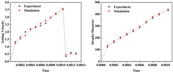Figure 12 shows the comparison of the simulation and experimental results. In summary, the jetting velocity predicted by the finite element model established in this paper, is 3.64 m.s−1, with an error of 3.02% from the experimental results, and the droplet diameter predicted by the model is 463.2 μm, with an error of 2.20% from the experimental results, which proves that the finite element model proposed in this paper can predict the jetting velocity and droplet diameter accurately.