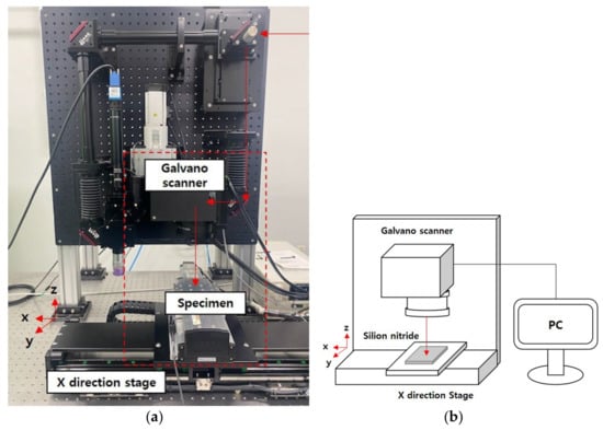 Equipment configuration for laser processing: (a) actual equipment for laser processing; (b) schematic of laser processing.