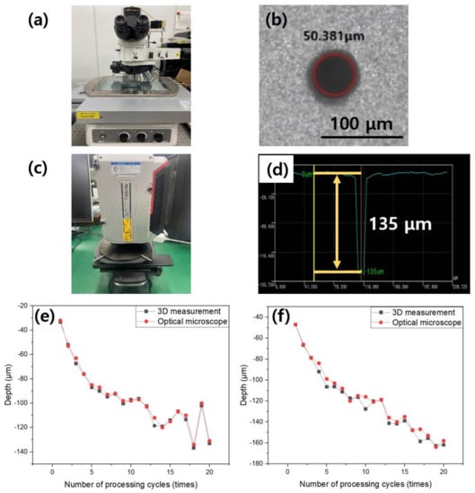Equipment for measuring diameter and depth, as well as a method for analyzing hole processing geometry. (a) Optical microscope for diameter measurement; (b) diameter measurement image using an optical microscope; (c) interferometer for depth measurement; (d) depth profile measured using an interferometer; (e) comparison of optical microscope and interferometric depth measurement according to the number of processing cycles under a of laser power of 105 mW; (f) comparison of optical microscope and interferometric depth measurements according to the number of processing cycles under a laser power 130 mW.