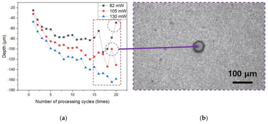 (a) Comparison of processing hole depth according to laser power and number of processing cycles; (b) observation image of molten material inside the processing hole for the outlier in (a).