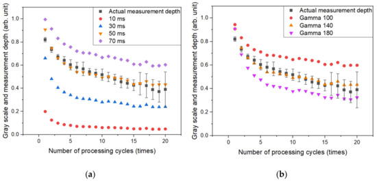 The dynamic range of the contrast inside the hole was investigated in relation to exposure duration and gamma correction value. As the exposure period grows, the amount of light that had been gathered and the brightness of the image also increase. Figure 6a compares the measurement data left and right images of the depth of the shallowest hole and the depth of the deepest hole, which was processed 20 times, under 10, 30, 50, 70, and 80 ms exposure time conditions. Background areas are dominant at 10 ms and remained at the borders even at 30 ms. Only the contrast inside the hole remained in the image after 50 ms, and data began to be lost when the depth was shallow after 70 ms. As depicted in Figure 7a, the image results were normalized with the highest gray value according to exposure time and shown in arbitrary units (AUs) to compare with the depth of the actual machined hole. The condition with the highest similarity to the actual hole measurement value was 50 ms, and the value was almost linearly decreased according to the number of laser repetitions. When the slope of each data set was compared to the actual hole depth, the condition of 50 ms was determined to be the closest. The dynamic range expands when the brightness of the image increases but decreases at on exposure time of 50 ms. Furthermore, it was discovered that under the condition of 80 ms, a significant amount of light from the processed section was collected, making it difficult to view the processed shape.