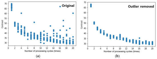 A masking technique was performed to eliminate the data from the unprocessed region in order to quantitatively discern solely the contrast inside the hole. An area of 170 × 170 pixels was retrieved by cutting away the outside region, using a square area in the middle of the hole as a mask and averaging the contrast data. The processed data and label data were arranged into a 10 × 20 × 3 data frame based on the experimental sequence and circumstances. When the data set of contrast characteristics is shown as a scatter plot, as illustrated in Figure 8a, data that are clearly distinguished from other points are included. These values should be considered outliers and eliminated. In two steps, outliers were discovered using the standard deviation approach, and then values with a standard deviation of ±2 or more were selected to remove outliers near the mean. Missing value processing was then performed for the removed outliers. Missing values were replaced with the average value of the same processing condition data. Figure 8b shows the data after the outliers have been removed and missing values have been processed. In this method, the imported data were scaled to reduce the scale gap between the image processing input data and the carefully measured label data. As a scaling approach, the Z-score normalization was employed to normalize all characteristics so that they all had a distribution with a mean of 0 and a standard deviation of 1.