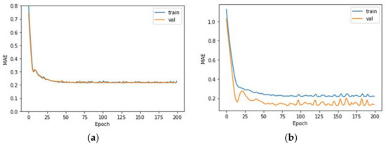 Outcome of selecting the best model and training it for 200 epochs. (a) An MAE result of 0.2172 was obtained based on the epoch for the condition of 1 to 20 processing times. (b) An MAE result of 0.1566 was obtained based on the epoch for the condition of 1 to 10 processing times.