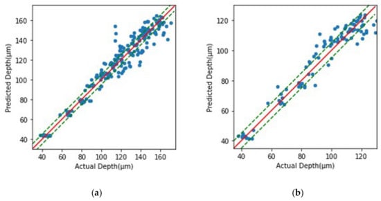 Learning was carried out across 200 epochs using preprocessed data and the model chosen for optimization. The MAE value according to the period is shown in Figure 10a, and a final score of 0.2172 was attained. Because this is a normalized result, the MAE value of the real data may be determined by multiplying the standard deviation of this data by 6.97. This indicates that the model trained on the hole image’s contrast and diameter data can estimate the real hole depth with an average error value of 6.97 μm. Figure 11a compares real data to data predicted by the learning model, with the dotted line indicating the ±5 μm point. As shown in the picture, the forecast error increases in the part where the actual machining depth is significant. This is apparently because, as the number of process cycles and hole depth increase, the contrast difference between adjacent situations reduces, and the discriminating power decreases. Looking at Figure 8b, while the data under the same processing settings had a contrast deviation of roughly five, data in a region with a high number of iterations are difficult to distinguish using the learning model because the contrast difference in the proximity condition is only one to two.