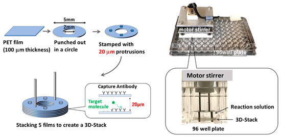 To address these concerns, the authors have developed a low-cost microfluidic device called the 3D-Stack that can be combined with 96-well plates [17]. The 3D-Stack is made by stacking polyethylene terephthalate (PET) films, with 20 µm gaps between the films, to serve as microfluidic paths to increase the binding area by using the surface of the films. The entire assembly process of 3D-Stack is performed using a press machine, which facilitates mass production and lowers the cost of device production. The entire 3D-Stack is coated with capture antibodies and rotated in a 96-well plate to provide circulating flow in the gaps to increase antigen binding. For subsequent reaction steps, the 3D-Stack can be easily moved to the adjacent well containing the reagents; finally, to quantify the enzyme reaction, the 3D-Stack is removed, and the remaining reaction solution in the wells can be read using a conventional plate reader. In our previous studies, the detection sensitivity of the 3D-Stack was higher than that of conventional methods when measurements were performed with the same reaction time as conventional methods [18,19]. Suzuki focused on the flow between films and suggested that there is a trade-off between surface area increase and flow rate increase, which affects the sensitivity of ELISA [20]. It was shown that surface modification improves the density of captured antibodies and can detect IgA (a protein contained in human saliva) in less than half the measurement time of conventional methods [21]. Detection with the 3D-Stack can quantify CD163 from dengue patient sera with the same accuracy as the conventional ELISA [22]. However, the reaction time of the 3D-Stack was longer than that of microfluidic channels with the same channel dimensions. The 3D-Stack requires about 30 min for incubation with a channel height of 20 µm, while the microfluidic channel of Weng et al. requires 3–7 min for incubation with a channel height of 80 µm [23]. In addition, Nakajima et al. reported that the enzymatic reaction time was only a few seconds in a microchannel with a channel height of 20 µm [24].