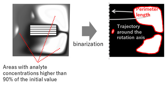 To discuss the necessity of introducing unsteady rotation, the calculation of concentration distribution and the interface between the high and low concentration areas was performed. An imaging process was applied to evaluate the interfacial area. Figure 3 shows a typical image of the concentration area for the analyte concentration of higher than 90% via binarization.