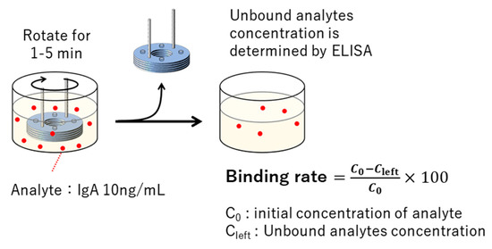3D-Stack was rotated for 1 to 5 min in a solution containing 10 ng/mL of human IgA. The concentration of unbound human IgA remaining in the solution was determined by sandwich ELISA using 96 wells. The binding rate to the 3D-Stack was calculated by subtracting the concentration of unbound human IgA from the initial concentration (Figure 5).