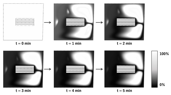 The changes in the concentration distribution of the analytes from the start of the reaction to 5 min later in the steady rotation condition were calculated, and the results are shown in Figure 6. The concentration distribution is shown in the grayscale, where the white is closer to the initial concentration and the black is the concentration of a zero percentage of analyte in the solution, decreased due to the analyte binding to the capture antibody on the 3D-Stack surface. This stagnant area, which concentration is close to the initial value, still exists after 5 min from the start of the reaction. Since the 3D-stack has axis symmetry, the concentration distribution in the rotation direction is almost the same. The reason why diffusion does not proceed sufficiently even though the wells are polarized into a high concentration area (white) and a low concentration area (black) is that the protein to be analyzed is less diffusible than small molecules such as ions and the diffusion force due to the concentration gradient is small because the initial concentration is low in the trace analysis.