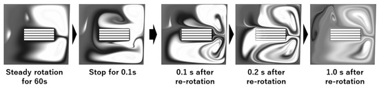 Figure 9 shows the calculated concentration distribution after stopping at 0.1 s and restarting the rotation. The concentration distribution after re-rotation is more uniform than before stopping, and some of the moving molecules flow into the gaps of the 3D-Stack. This is because the highly concentrated fluid masses in which the molecules were stagnant are stretched by the flow generated via the stopping and re-rotating operation. Microscale mixing is done by diffusion [34]. Therefore, when mixing solutions A and B, increasing the interfacial area of the solutions promotes diffusion. In the case of a microfluidic mixer, the interfacial area is increased by increasing the number of branches in the flow path [35]. In addition, J. Baldya et al. explained the mechanism of micro-mixing as an engulfment deformation diffusion (EDD) model, in which the fluid mass is entrained in the vortex and stretched, leading to molecular diffusion [36]. The results of the present analysis can also be interpreted as the high-concentration fluid masses formed above and below the 3D-Stack during the steady rotation. They are stretched by the radial inward flow due to stopping, and the vortex structure generated by the re-rotation promotes molecular diffusion by increasing the interfacial area.