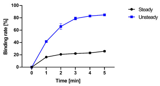 The binding rates for each reaction time are evaluated experimentally, and the results are shown in Figure 14. In the case of steady rotation, the binding rate after 5 min was 25.9%, while in the case of unsteady rotation, the binding rate increased to 84.9%. This means the unsteady rotation significantly increases the amount of molecular binding per unit of time.