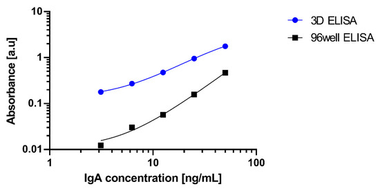 Figure 15. Calibration curve for ELISA of IgA using 96 well and 96 well with 3D-Stack.