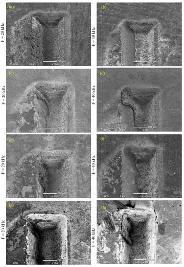 29] used a picosecond laser to fabricate cavities on alumina ceramics. They studied the effect of wobble frequency, wobble amplitude, wobble pitch, and linear speed on the ablation depth, surface roughness, and defect-free cuts of desired geometries with high precision. The results show that deeper cuts and smaller kerf tapers are produced by smaller wobble amplitudes and lower frequencies. In addition, surface roughness increased significantly for wobble pitches above 30 µm. Preusch et al. [