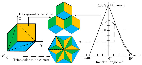 Two common types of retroreflectors are the cat’s eye and the cube corner. The former has a large receiving angle and large divergence characteristics, while the latter has a higher reflection efficiency [13]. The cube corner retroreflector will be discussed only in this paper because of its high reflectivity. According to the aperture shape of the cube corner, it can be divided into triangular and hexagonal cube corners, as shown in Figure 1. The triangular retroreflectors are only capable of retroreflecting 66.7% of the incident light. In contrast, hexagonal cube corner retroreflectors (HCCRs) can theoretically reflect up to 100% of the incident light [14].
