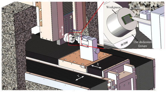 The machine tool consists of three linear axes (X-, Y-, and Z-axis). The workpiece is mounted on the inclined plane of the dedicated fixture, and the dedicated fixture is set on the Z-axis, while the diamond tool is located on the X-axis and moves linearly with the X-axis and Y-axis.