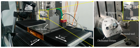 The machining experiments are conducted on three-axis ultraprecision lathes, and they consist of three linear axes (X, Y, Z), as shown in Figure 9. The X-axis, Y-axis, and Z-axis are 300 mm, 300 mm, and 150 mm, respectively. Cutting fluids are used to improve the tool life and bring the cutting heat out. The optical system is applied to monitor the machining process. The spectral confocal sensor (resolution of 3 nm, maximum sampling frequency of 66 kHz) is used to measure the installation error of the dedicated fixture, to make sure the machine setup error is below 0.01°.