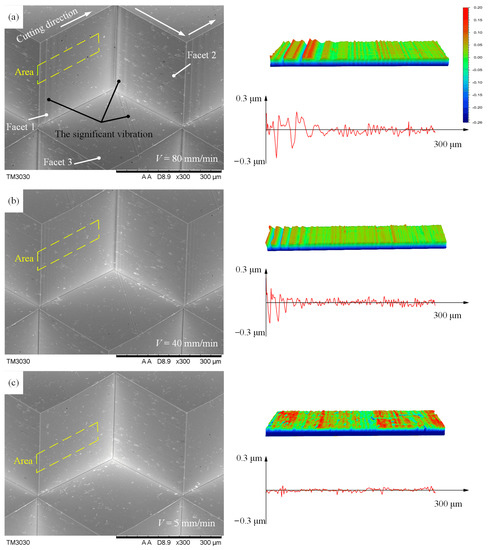 For further analysis, the machined facets of Al6061 were measured by SEM and the optical profiler, and the measured results are shown in Figure 11. Three reflective facets show significant defects at high speeds (40 mm/min and 80 mm/min), as shown in Figure 11a,b. The reason for these defects is the change of cutting direction, as shown in Figure 10a. Especially at such high cutting speeds, the abrupt change in cutting directions results in a significant jerking, causing the machine tool to vibrate. This vibration will be transferred to the machined surface through the diamond tool, resulting in a sharp increase in surface roughness, as shown in the morphology of Figure 11, while under low-speed cutting (less than 10 mm/min), the three cutting surfaces show excellent performance, as shown in Figure 11c. In addition, the reason for the different effects of the abrupt change in cutting directions on the three surfaces is that the vibration caused at a high speed occurs mainly in the direction parallel to the cutting speed, which results in a higher surface roughness on Facet 1 and 2 than on Facet 3.