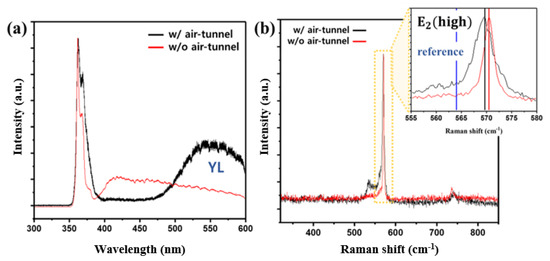 (a) PL spectra of GaN films with/without an air tunnel at 300 K. (b) Raman spectroscopy of GaN films with/without an air tunnel.