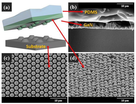 The GaN template with the air tunnel was then separated from the substrate. Subsequently, PDMS was applied to the surface of the GaN film with an air tunnel, and CLO was performed by immersing the film in KOH solution [38,39]. Figure 5a shows a schematic of the CLO data for the GaN film and TPSS. The air tunnel allowed the KOH solution to separate the GaN from the substrate in approximately 5 h. Figure 5b presents a cross-sectional SEM image, indicating that the GaN film with PDMS attached to the surface was lifted off. Although the film was detached from the substrate, it was neatly separated as it maintained its shape prior to lift-off. Figure 5c shows a top-view SEM image of the TPSS following the CLO process. Only GaN was selectively etched because there were only a few residues on some of the lenses. Because no material other than the substrate itself was present, the substrate can be reused, which is an advantage. Figure 5d shows a tilted SEM image of the bottom of GaN, where the air tunnel was located. The interface where GaN nucleation occurred had a rough surface, owing to the damage caused by chemical etching. Because GaN was grown using the ELOG technique, the bottom surface of GaN was cone-shaped. Furthermore, the cone-shaped GaN pattern corresponds to the pattern spacing and position of the TPSS. Thus, the KOH etchant effectively penetrated the air tunnel and etched the interface between the TPSS and GaN. We expect that the structure of the GaN template containing the air tunnel will enable rapid CLO via effective etchant injection.