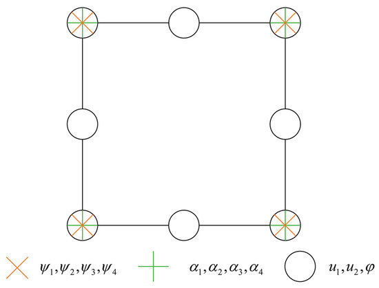 According to Equations (13)–(20), it can be deduced that the equivalent strain matrices B ε , B E , B η , B u ¯ and B χ respectively are: