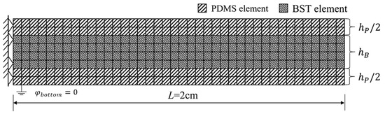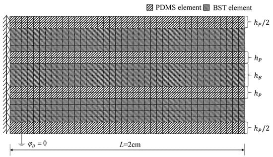 Figure 2 shows a finite element schematic diagram of a microscale flexoelectric laminated cantilever beam structure with a fixed left end and a free right end. The cross-section of the laminated beam is rectangular, with a BST flexoelectric layer in the middle, and its upper and lower surfaces are coated with a high-temperature electrode layer with a negligible thickness, and a PDMS flexible layer is attached to the outside of the electrode layer. The beam length is 2 cm, the BST layer thickness is h B , and the flexible layer thickness is both h P / 2 = 5   μ m , intrinsic size characteristic parameters of the material is l = 5   μ m . The material parameters of the laminated beams are shown in Table 1.