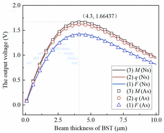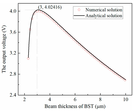 From the variation law of the output voltage of the structure with BST thickness shown in Figure 5, it can be seen that the numerical solution is in good agreement with the analytical solution; as the thickness of the BST layer increases, the output voltage of the overall structure increases first and then decreases; The output voltage of the composite beam structure reaches the maximum value when the thickness of the BST layer is 3 μm, and the error between the numerical solution and the analytical solution is about 0.7%, which is within the acceptable range.