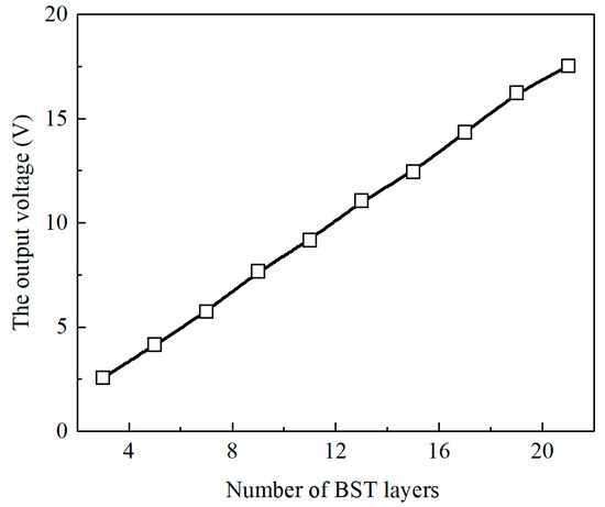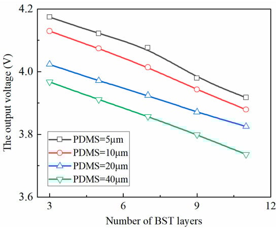 Setting the thickness of the BST layer (3 μm) and the uniform load q = 100   μ N / m applied to each BST layer, the variation law of the output voltage of the BST/PDMS flexoelectric laminated cantilever structure with the number of BST layers under different PDMS layer thicknesses is shown in Figure 6.