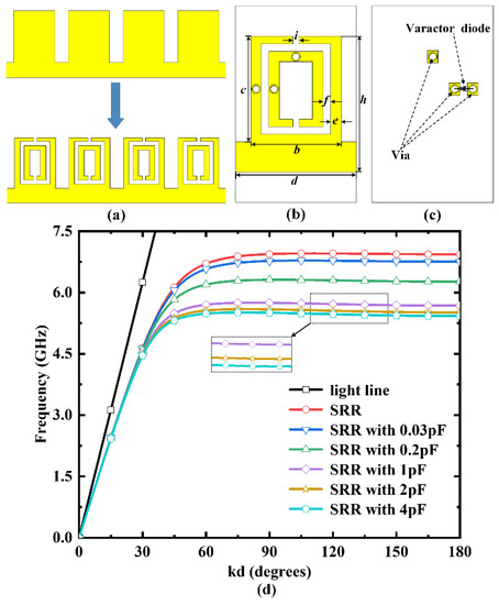The dispersion curves at different capacitance, based on the fundamental mode of the proposed SSPPs unit structure, can be used to analyze the relationship between frequency and kd degrees. Here, a SRR structure with nothing loaded and SRR structure with different capacitance loaded were selected for dispersion analysis. The experiment results can be seen in Figure 1d, where the black line stands for the light line in free space, and the figure clearly shows that the asymptotic frequency was higher when there was a dielectric plate loaded varactor diode. Meanwhile, the asymptotic frequency decreased with the increase in the capacitance of the varactor diode. Hence, the capacitance can be changed by programming the loaded varactor diode, which can control the dispersion property of SRR structure reasonably and realize reconfigurable SSPPs unit structure.