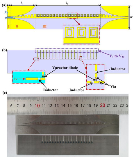 Figure 2c shows the fabricated SSPPs device based on the standard PCB fabrication process. To prevent signal crosstalk of DC bias voltages and radio frequency, a metal wire was loaded onto the back of the substrate, which relates to the inner rings of SRR through vias. The inductors with 30 nH were loaded in lines to eliminate the mutual interference between signals. The metal wire on the back of the substrate was loaded with 0 V voltage, and the high-impedance lines were loaded with DC bias voltages. The capacitance of the varactor diode could be controlled independently by programming the bias voltages on each line, which ranged from V1 to VN, respectively. Meanwhile, the SRR unit loaded on the SSPPs sensor at different locations could be selected for defect detection; this process is called dynamic control, also known as the electronic scanning method.