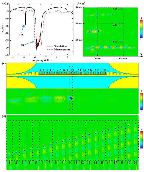 The simulated and measured transmission coefficients of the SSPPs sensor can be seen in Figure 3a, when and . Due to a large capacitance difference , there were frequency bands of the two rejections in simulation and measurement, called RA and RB. Rejection RA occurred at 5.15 GHz, and RB occurred at 6.10–6.70 GHz.