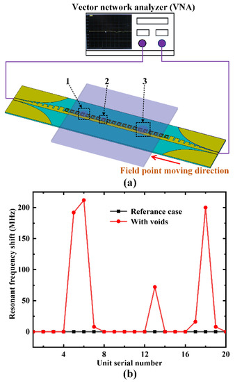 Figure 4b shows the change in resonance frequency shift as the field concentration phenomenon moves from unit “1” to unit “20” in sequence. Additionally, there were obvious resonance frequency shifts at the fifth, sixth, thirteenth, and eighteenth SRR units, indicating that there were some defects above the 4 SRR units, corresponding to the “1”, “2”, and “3” defects in Figure 4a. Because defect 3 had the largest volume, which had the greatest impact on the electric field distribution, its resonant frequency shift had the maximum value. On the contrary, defect 2 had the smallest volume and had a small impact on the electric field distribution. Its resonant frequency shift was the minimum value. Defect 3 had the largest volume and, therefore, had the greatest impact on the electric field distribution. As a result, it had the maximum resonant frequency shift. On the other hand, defect 2 had the smallest volume and had a small impact on the electric field distribution. Consequently, its frequency shift was the minimum value.