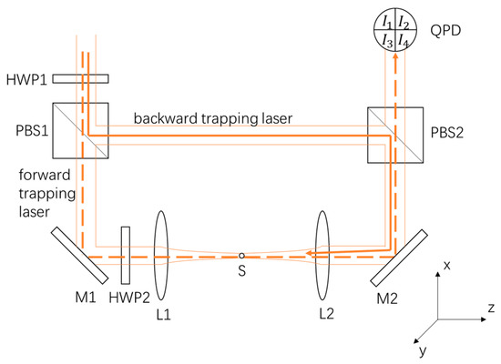 As Figure 1 presented, we used the half-wave plate HWP1 and the polarized beam splitter PBS1 to separate a 1064 nm laser beam into two beams. We named the transmitted beam the forward trapping laser, and the reflected beam the backward trapping laser, represented as dashed and solid lines, respectively. The forward trapping laser was a linear polarized beam in the horizontal direction, and the backward trapping laser was a linear polarized beam in the vertical direction. The two trapping beams, which were focused by the lenses L1 and L2, levitated a 10-micron-diameter SiO2 sphere S in a vacuum chamber. The pressure in the vacuum chamber was set to 10 mBar. The NA of L1 and L2 were . The power of both trapping beams arriving at the sphere was . After being scattered by the sphere, the forward trapping laser then transmitted through the polarized beam splitter PBS2 and was detected by a homemade QPD. The half-wave plate HWP2, mounted on a rotation stage, was used to control the polarization state of the trapping laser. There was also a polarimeter we used to measure the polarization of the two trapping beams which is not shown in the figure.