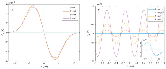 Figure 3 shows the optical force distribution with different phase differences. As we can see from Figure 3a,c, the two kinds of phase difference do not affect the radial force difference much. Figure 3b shows the axial force distribution of different phase differences in the first kind. Not only did the axial balanced point translate in the axial direction, but the maximum value and gradient of the axial force also changed with the second kind of phase difference. As presented in Figure 3d, the axial force distribution translates by a distance related to the wavelength in the axial direction when the second kind of phase difference changes, with its maximum value and gradient at a balanced point unchanged.