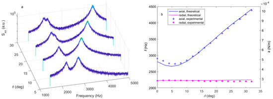 Figure 5a is a series of the PSD spectrum of the x-direction signal , calculated from the QPD. The rotation angle corresponds to the angle of polarization of the forward trapping beam compared to the direction perpendicular to the backward trapping beam. The polarization angle is controlled by the rotation angle of the half-wave plate HWP2 . Ideally, the PBS1 polarizes the forward (backward) propagating beam in the horizontal (vertical) direction. The optical axis of the HWP2 is initially consistent with the polarization direction of the forward light passing through it. When the HWP2 is rotated by , the polarization of the two beams becomes , . There are two peaks on each spectrum, which are signals originating from the radial motion and the coupling signal from the axial motion. We can see the peak with a lower resonant frequency, which is related to the radial motion and is not sensitive to the change in polarization, while the coupling signal from the axial motion at a higher frequency changes significantly. The experimental resonant frequency is extracted from Figure 5a by fitting the PSD curves near the resonant peaks with the Lorenz function [17], plotted in Figure 5b. The blue plus and magenta stars are the experimental resonant frequency of the axial and radial motion, respectively, while the lines are the calculated frequency with the polarization of the two trapping beams measured by the polarimeter, which is , . The experimental and numerical results match well. Despite the experimental setup that attempts to achieve the orthogonal polarization condition, the non-ideality of the optical elements and misalignment prevent the fulfillment of the theoretical condition. For example, the PBSs we used in the experiment have different extinction ratios of polarization of transmission and reflection, which is about for transmission and to for reflection, according to the factory data.