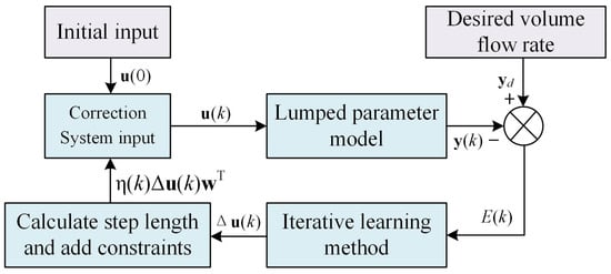 Based on the algorithm principle mentioned above, the control input corresponding to the desired injection volume flow rate can be iteratively computed according to the calculation process shown in Figure 4. Firstly, the expected injection volume flow rate at the nozzle is designed and set as the iterative optimization target yd. Secondly, the model output y(k) corresponding to any initial system input u(0) is calculated, and the correction amount of the control input is calculated according to Equations (14)–(21). This process is repeated until the total error E(k) converges to the set threshold. Finally, the corresponding control input is converted into a voltage waveform, which generates the expected injection behavior when driving the PPH and thus optimizes the fluid injection performance.